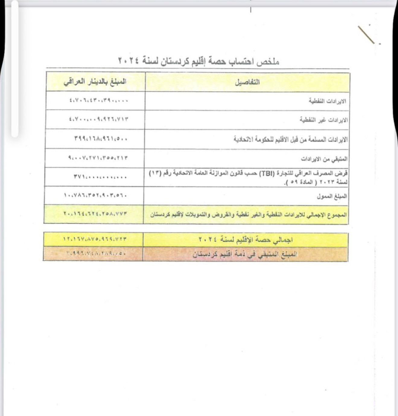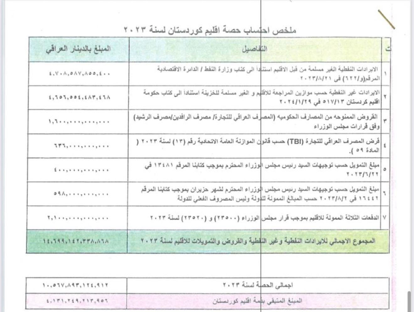 3-وفق القانون، أصدر ديوان الرقابة المالية الاتحادي، وديوان الرقابة المالية في الإقليم، تقاريرهما حول حسابات حكومة الإقليم، وتبين وجود إيرادات نفطية وغير نفطية لم يتم تسليمها إلى الحكومة الاتحادية، وعلى الرغم من أن التمويل من وزارة المالية كان ضمن حصة الإقليم المحددة في قانون الموازنة، إلا أن الإيرادات النفطية وغير النفطية التي امتنعت حكومة الإقليم عن تسليمها إلى الخزينة العامة، أدت إلى تجاوز حصة الإقليم المحددة بقانون الموازنة وقرار المحكمة الاتحادية (وفق الجداول في كتابنا المذكور آنفا والجداول المرفقة).
