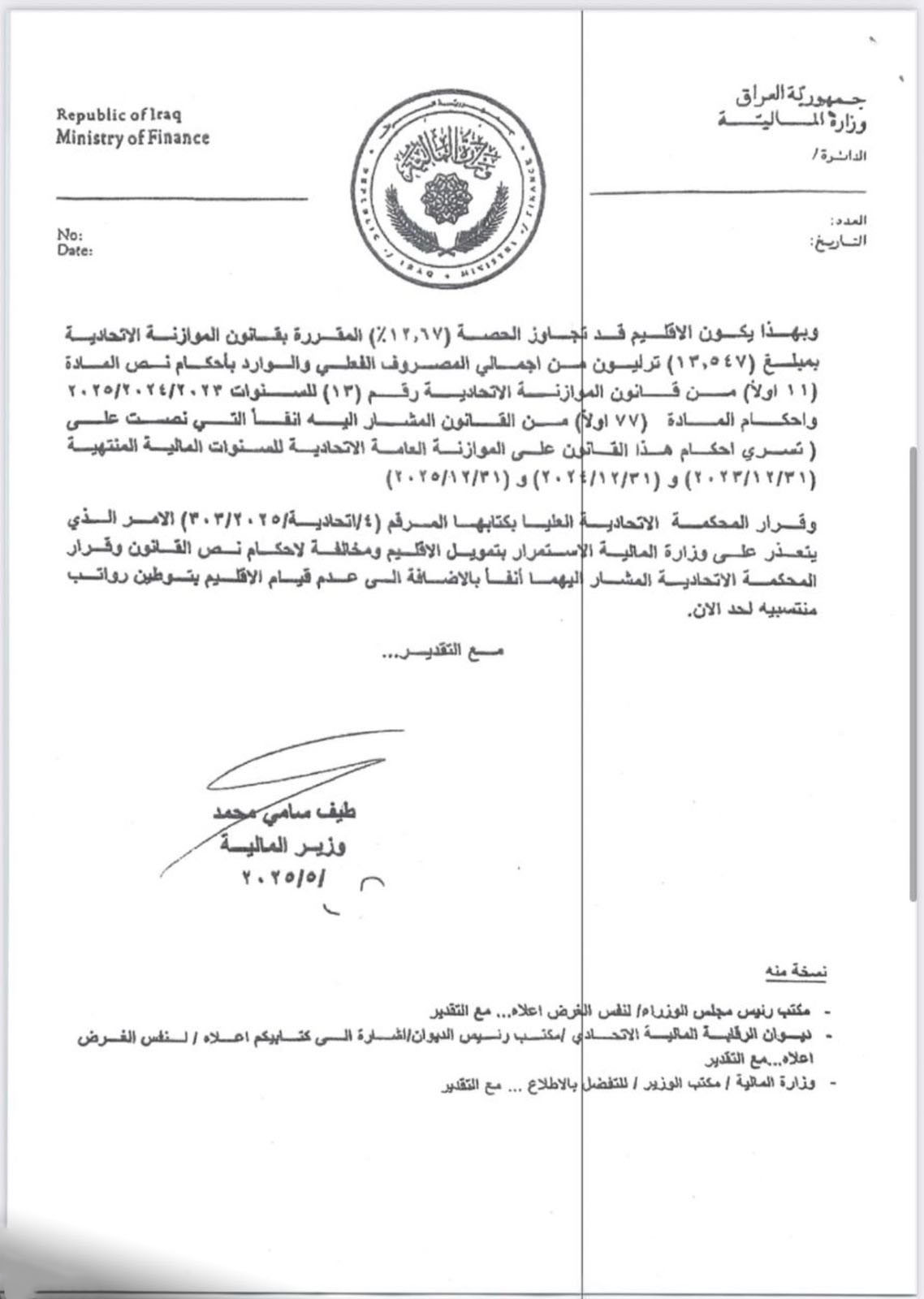 وذكرت الوزارة في بيان، أن “بعض التصريحات والمنشورات تداولت تفسيرات لكتاب وزارة المالية لحكومة إقليم كردستان، بشأن تعذر تمويلها في شهر أيار 2025 للأسباب المذكورة بكتابها المرقم بالعدد (14502) في 2025/05/28”.