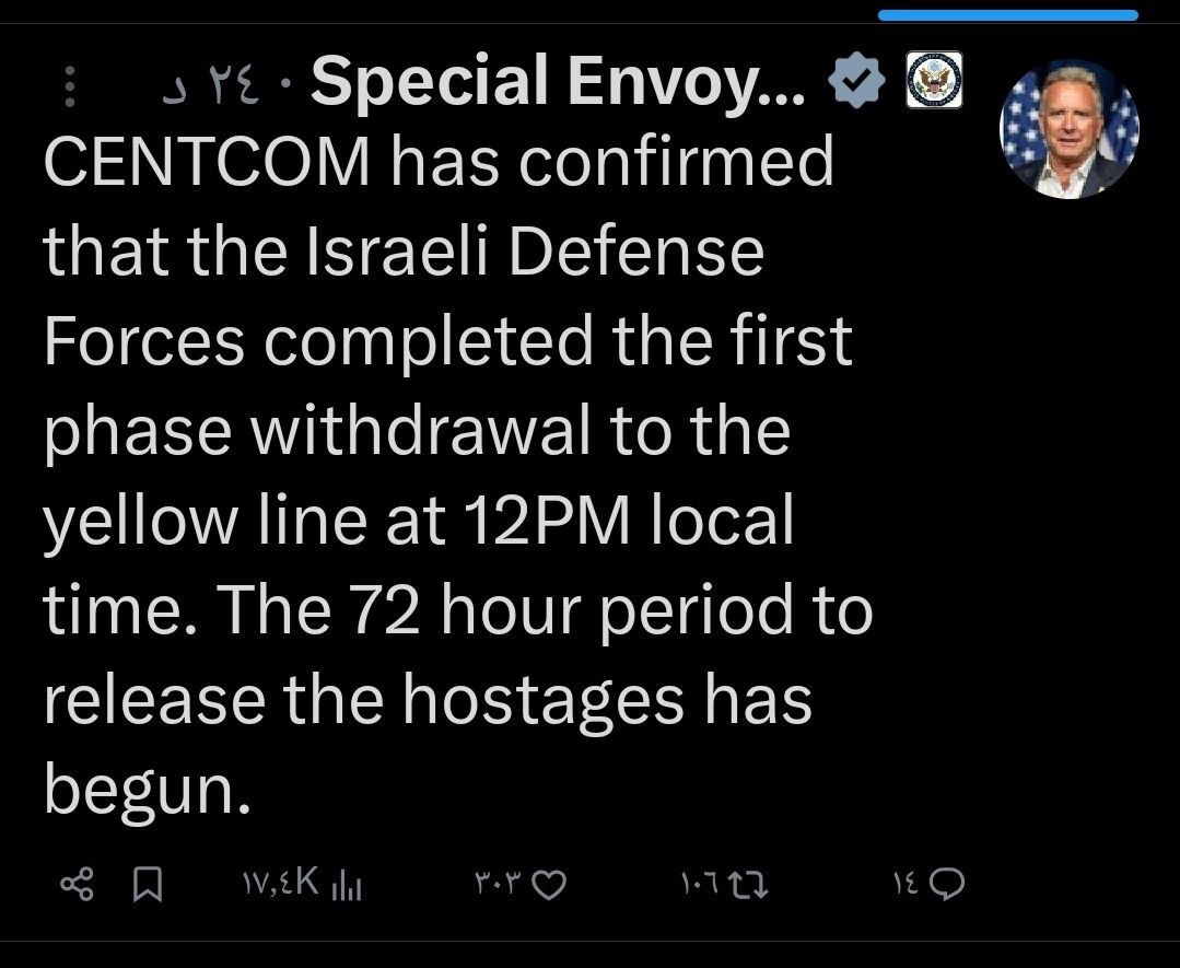 وكتب ويتكوف في حسابه عبر منصة “إكس”: “أكدت القيادة المركزية الأمريكية (سنتكوم) أن (قوات الإحتلال) أكملت المرحلة الأولى من الانسحاب إلى الخط الأصفر عند الساعة 12 ظهرا بالتوقيت المحلي وبدأت مهلة الـ72 ساعة لإطلاق سراح الرهائن”.